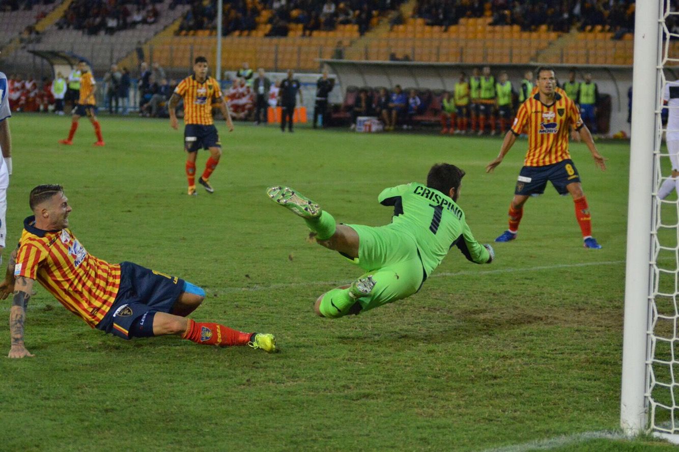 Non è della partita Mancosu, a collaborare con le punte Caturano-Torromino c’è Costa Ferreira. Dopo una lunga fase di studio al 17° c’è la prima occasione per il Lecce con Costa Ferreira ma il suo tiro a giro esce di poco fuori. Al 20° sempre con Costa Ferreira i salentini sfiorano il vantaggio ma il centrocampista offensivo dei giallorossi invece di piazzare la palla sul palo più lontano opta per un assist per il bomber di Scampia il quale non è pronto per la finalizzazione. Quattro minuti più tardi è la volta di Armellino con un tiro a giro ma Crispino è sulla traettoria e para. Il Lecce al 25° insiste e dopo un forcing estenuante nei sedici metri ospiti, Costa Ferreira serve Torromino che di sinistro impegna Crispino.