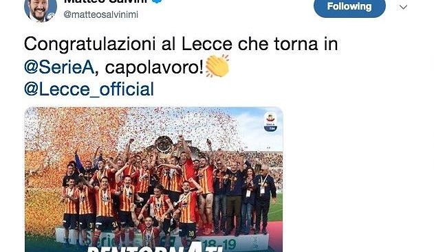 Dopo sette anni passati nell’inferno chiamato Lega Pro, nessuno avrebbe mai immaginato che il Lecce, in una sola stagione, avrebbe conquistato la promozione in A. E quando la massima serie è stata blindata da Petriccione e La Mantia in un Via del Mare delle grandi occasioni ecco un’altra cosa che in pochi si sarebbero aspettati: le congratulazioni del Ministro dell’Interno e vicepremier Matteo Salvini.