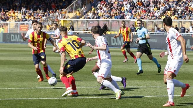 Al secondo minuto di recupero arriva il vantaggio del Lecce. Sansone riceve palla e scarica di testa per l’accorrente Krstovic che dal limite scaglia una sassata sulla quale nulla può fare il portiere dei brianzoli.