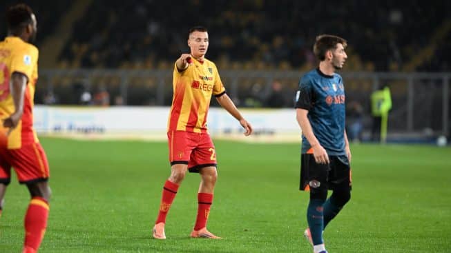 Il primo tiro della gara è del Napoli al 12mo con Gilmour dal limite, Falcone devia in corner. Al 16mo Olivera di testa manda alto. al 26mo giallorossi pericolosi, Pierotti recupera palla e serve Berisha che dal limite manda di poco fuori. al 30mo Napoli a un passo dal gol, cross di Lang, l’estremo dei salentini devia, la sfera arriva all’accorrente Politano che a porta vuota spedisce sopra la traversa. Al 35mo ancora un’occasione per i partenopei. Gimur serve Olivera, girata sul primo palo del difensore uruguagio, la sfera supera Falcone, ma sulla linea respinge Tiago Gabriel.