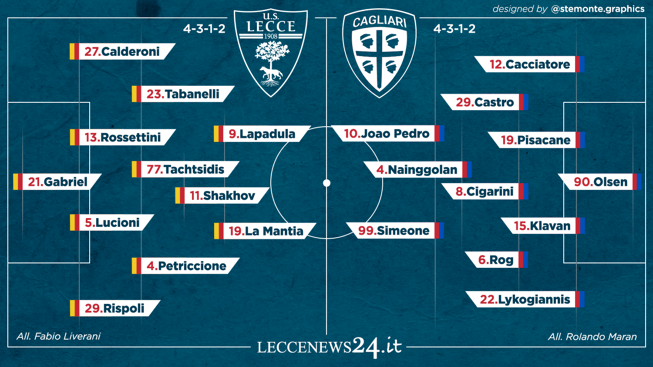 I sardi dovrebbero optare per un 4-3-1-2 speculare, con Olsen tra i pali, Cacciatore, Pisacane, Klavan e Lykogiannis in difesa, Cigarini tra le linee supportato da Castro e Rog, mentre in avanti agiranno Nainggolan, ‘El Cholito’ Simeone e João Pedro.