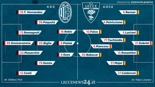 Il modulo sarà il 4-3-3 con Donnarumma tra i pali, Musacchio e Romagnoli nel cuore della difesa con Theo Hernández e Conti lungo le corsie esterne; Biglia in mezzo sarà affiancato da Kessie e Paquetà, mentre in avanti spazio a Suso, Rebic e, appunto, Piątek.