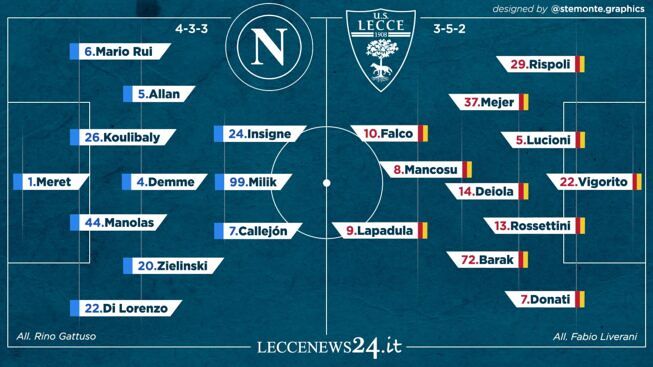 Tra i pali ancora fiducia a Meret, mentre nel cuore della difesa si rivede Koulibaly, in coppia con Manolas; Di Lorenzo torna così lungo l’out destro, suo dirimpettaio sarà Mario Rui; in mezzo spazio a Demme, affiancato da Zielinski e uno tra Allan e Lobotka (con il primo in lieve vantaggio); tridente offensivo composto da Milik, Insigne e Callejon, con Politano comunque pronto per una maglia.