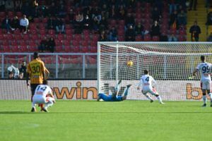 Al 25mo pareggio del Lecce. Falco crossa in area per Tabanelli che con perfetto inserimento di testa trafigge l’estremo difensore dei grifoni.