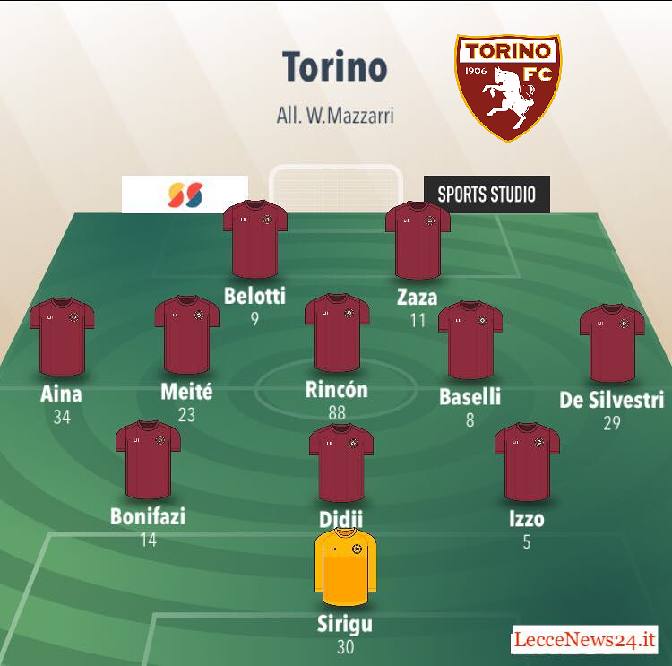 La formazione anti-Lecce è pressoché. Il 3-5-2 è il modulo di partenza e davanti a Sirugu, al posto del rientrante Nkoulou ci sarà ancora Djidji affiancato da Izzo e Bonifazi. Folto il centrocampo che ruota attorno a Rincon, con De Silvestri, Maselli, Meitè e Aina, mentre in attacco occhio al tandem Zaza-Belotti.
