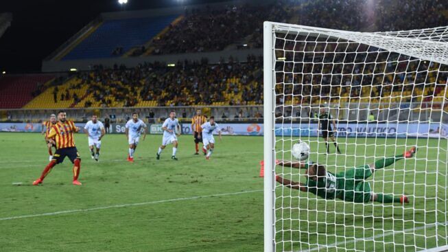 Al 40mo i salentini vanno in vantaggio. Gendrey lancia Coda che tira di collo pieno, la sfera, però, viene rimpallata da Scaglia con un braccio, il direttore di gara lascia proseguire, ma viene richiamato dalla sala Var, l’arbitro quindi va a visionare le immagini e decide di assegnare il penalty. Sul dischetto si presenta Coda che mette la sfera alla sinistra dell’estremo dei lariani.