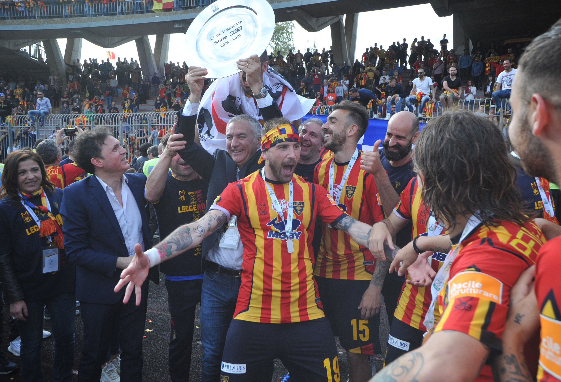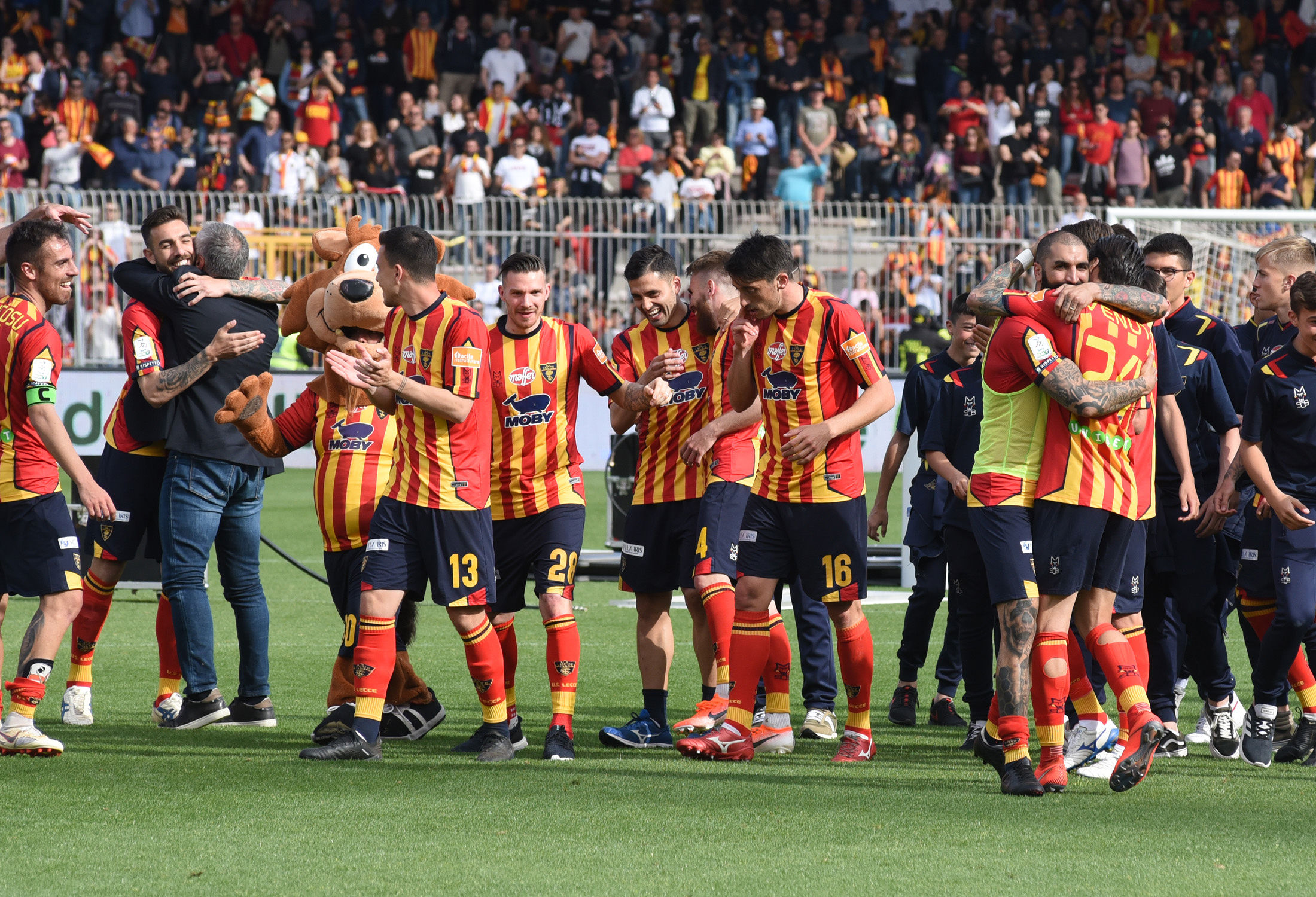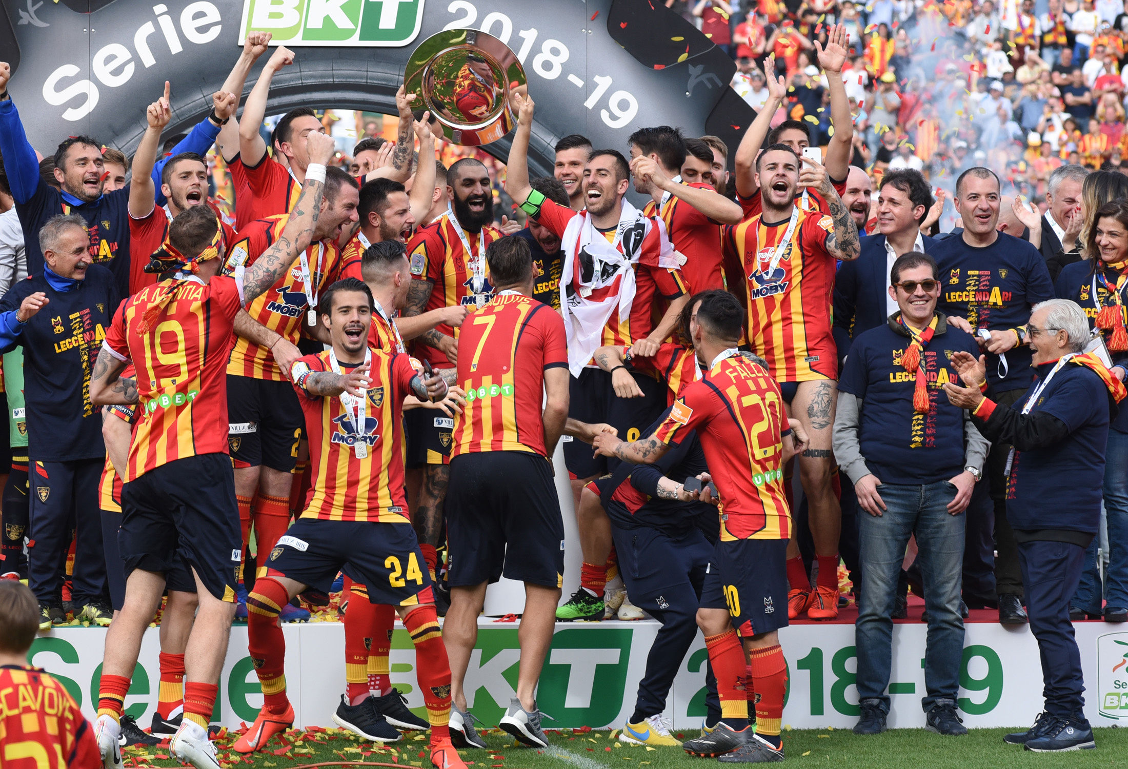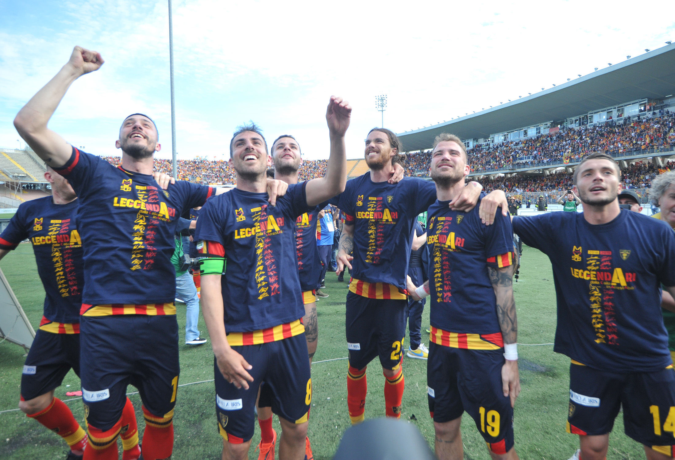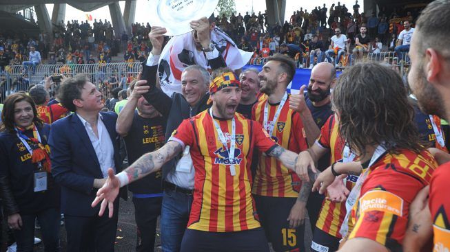 Dirigenza, staff, tecnici e giocatori: sono tutti in campo a raccogliere i sorrisi e le lacrime dei tifosi. Giro di campo, la “ola” sotto le Curve, fino al momento della premiazione da parte della Lega B. Il cielo si tinge di giallorosso tra coriandoli, bandiere e speranze. Il Lecce è tornAto!