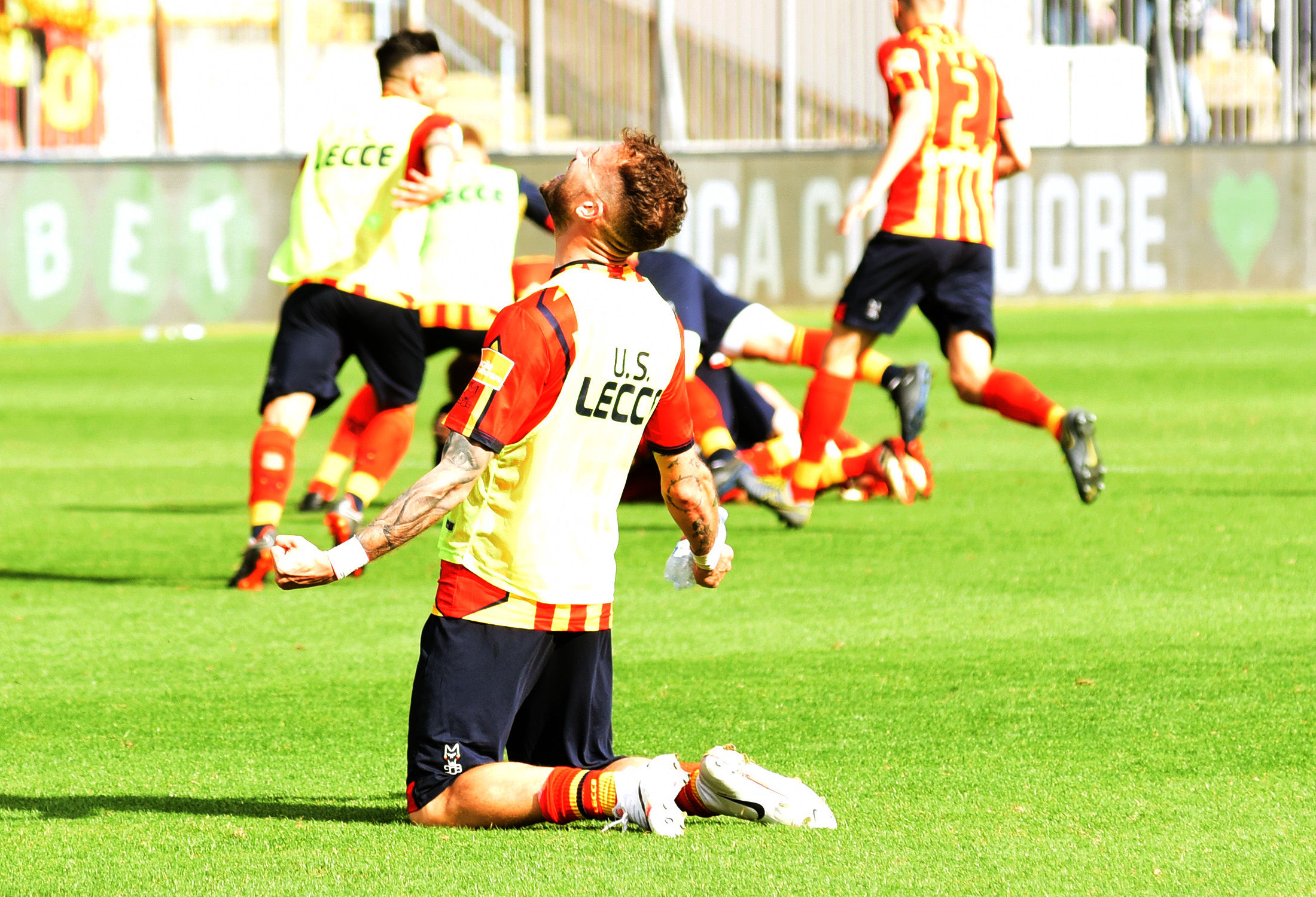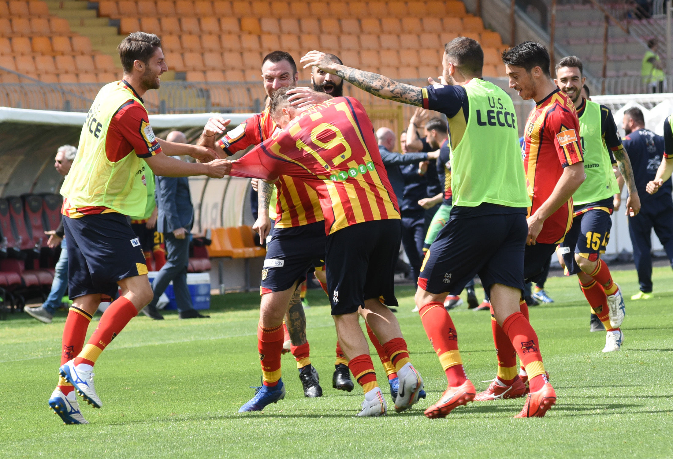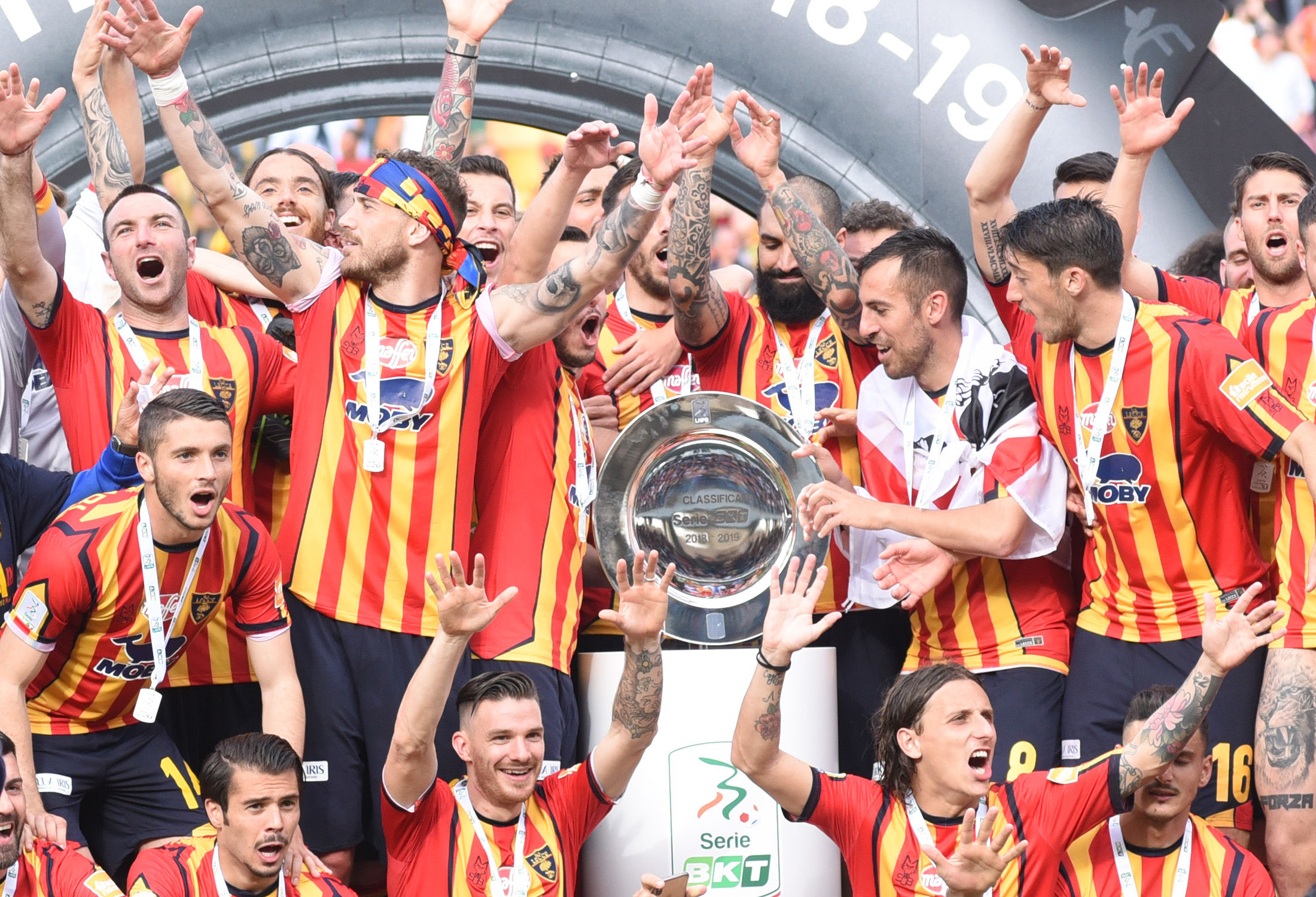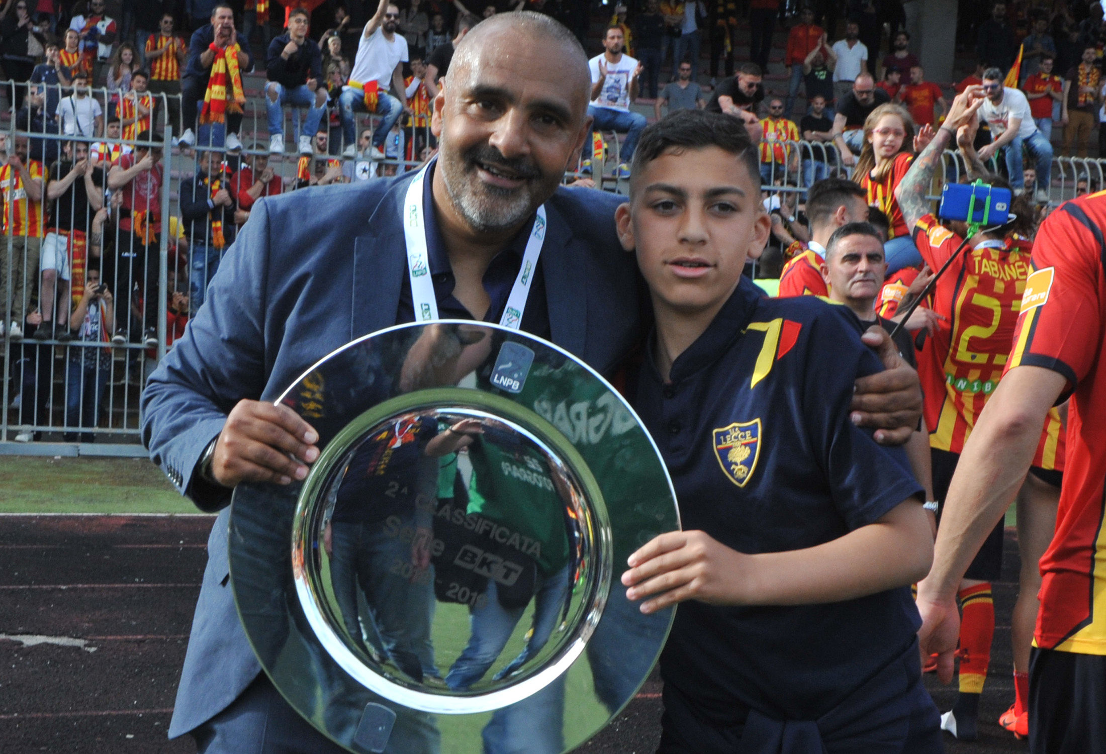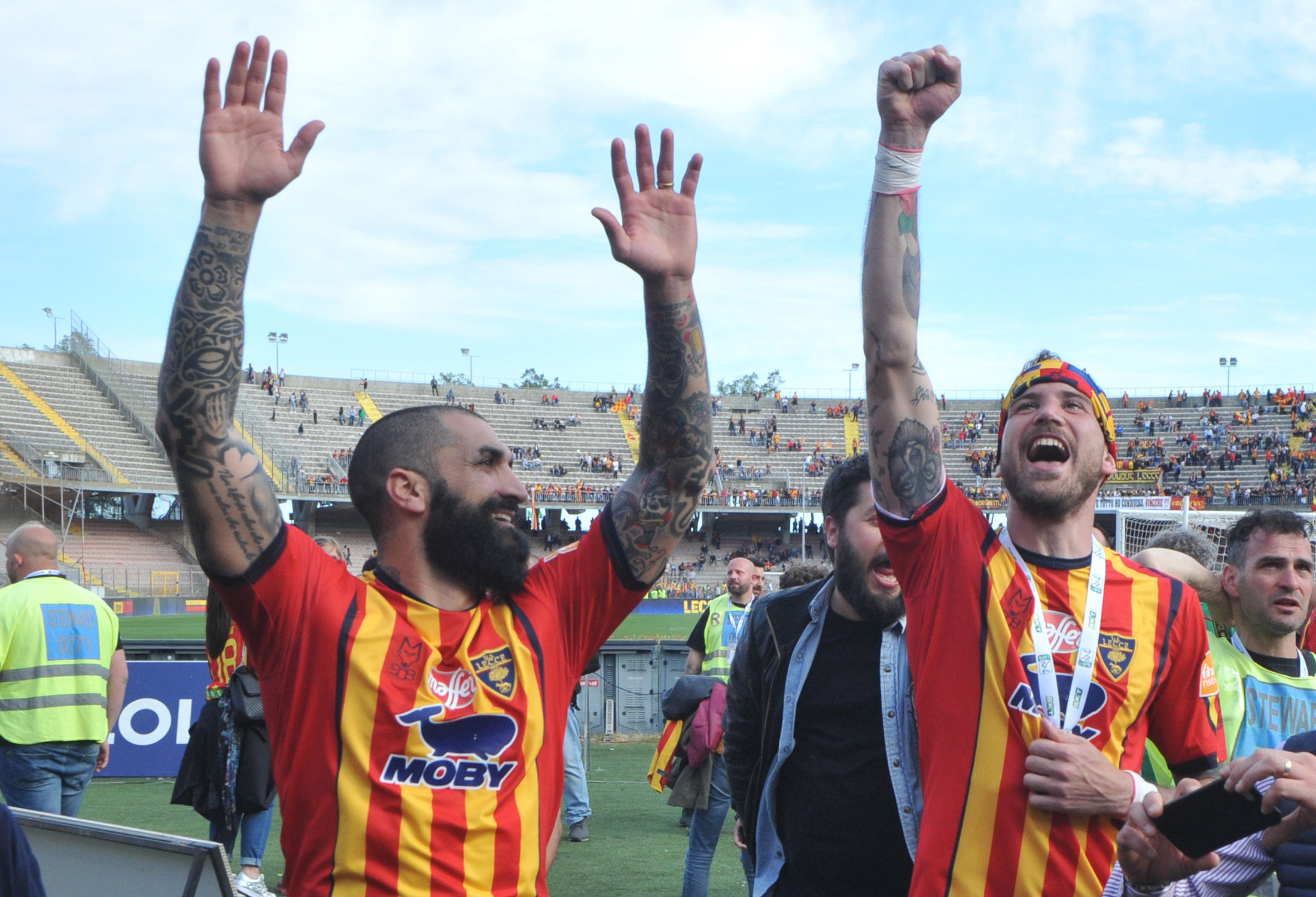 Dirigenza, staff, tecnici e giocatori: sono tutti in campo a raccogliere i sorrisi e le lacrime dei tifosi. Giro di campo, la “ola” sotto le Curve, fino al momento della premiazione da parte della Lega B. Il cielo si tinge di giallorosso tra coriandoli, bandiere e speranze. Il Lecce è tornAto!