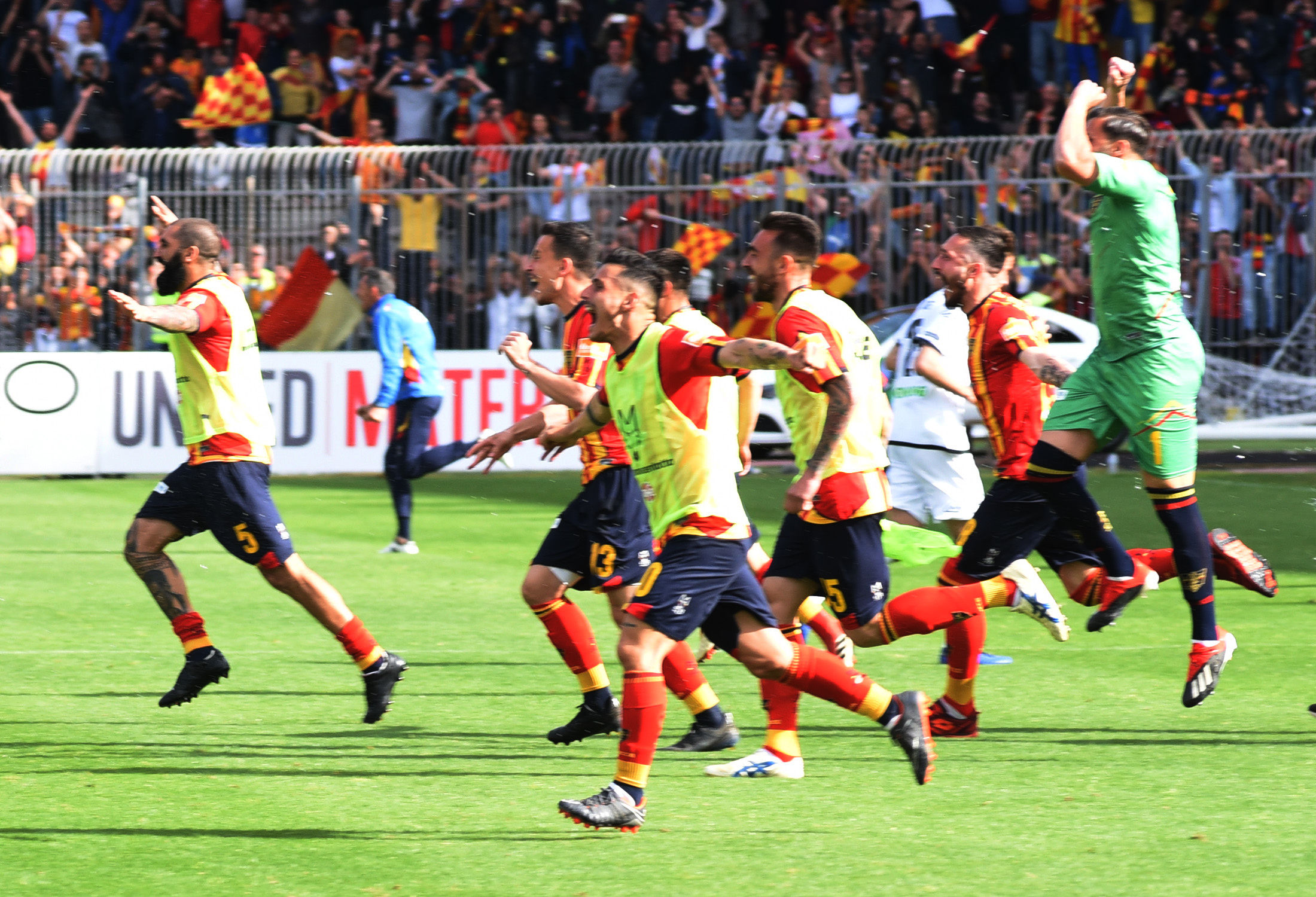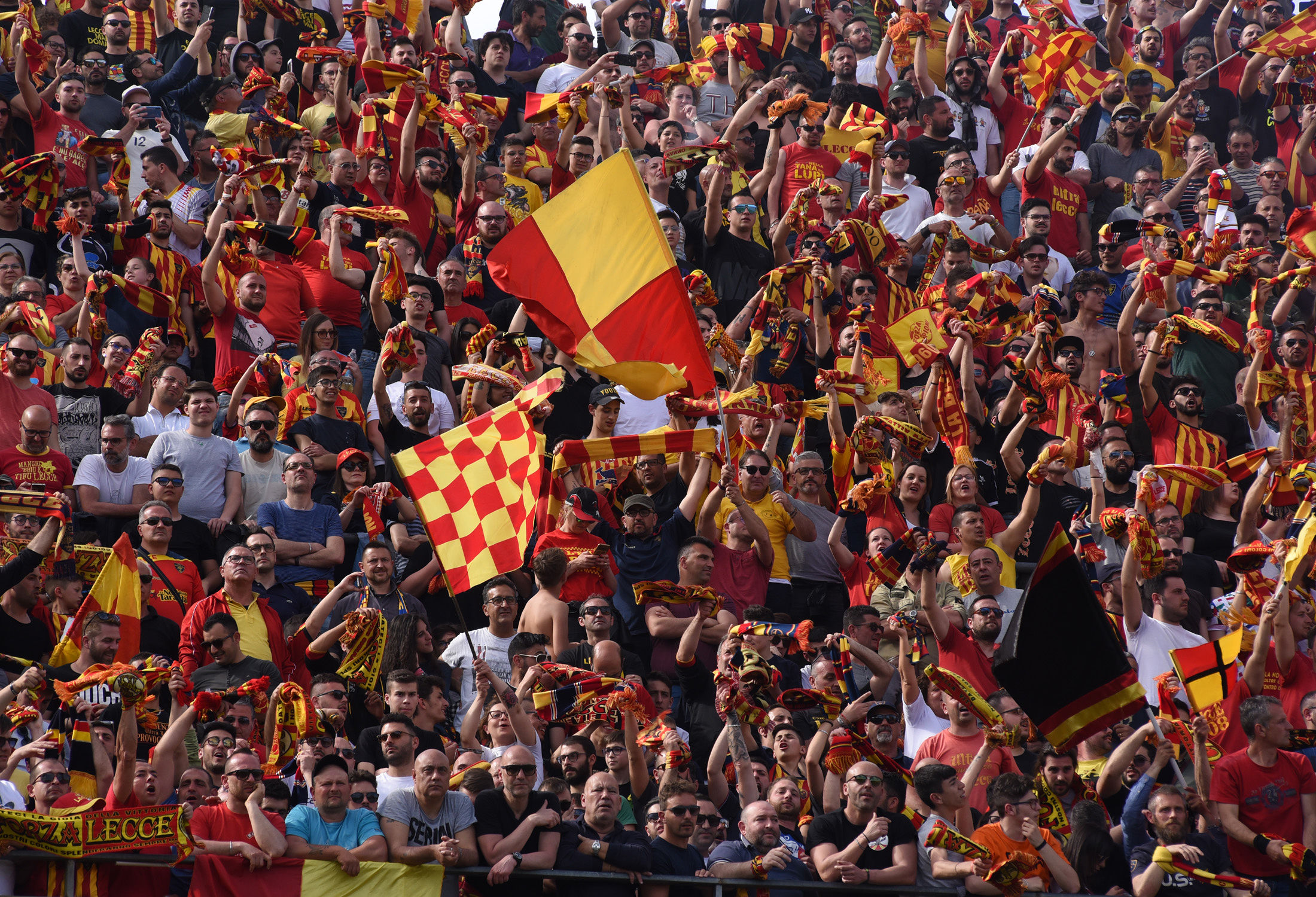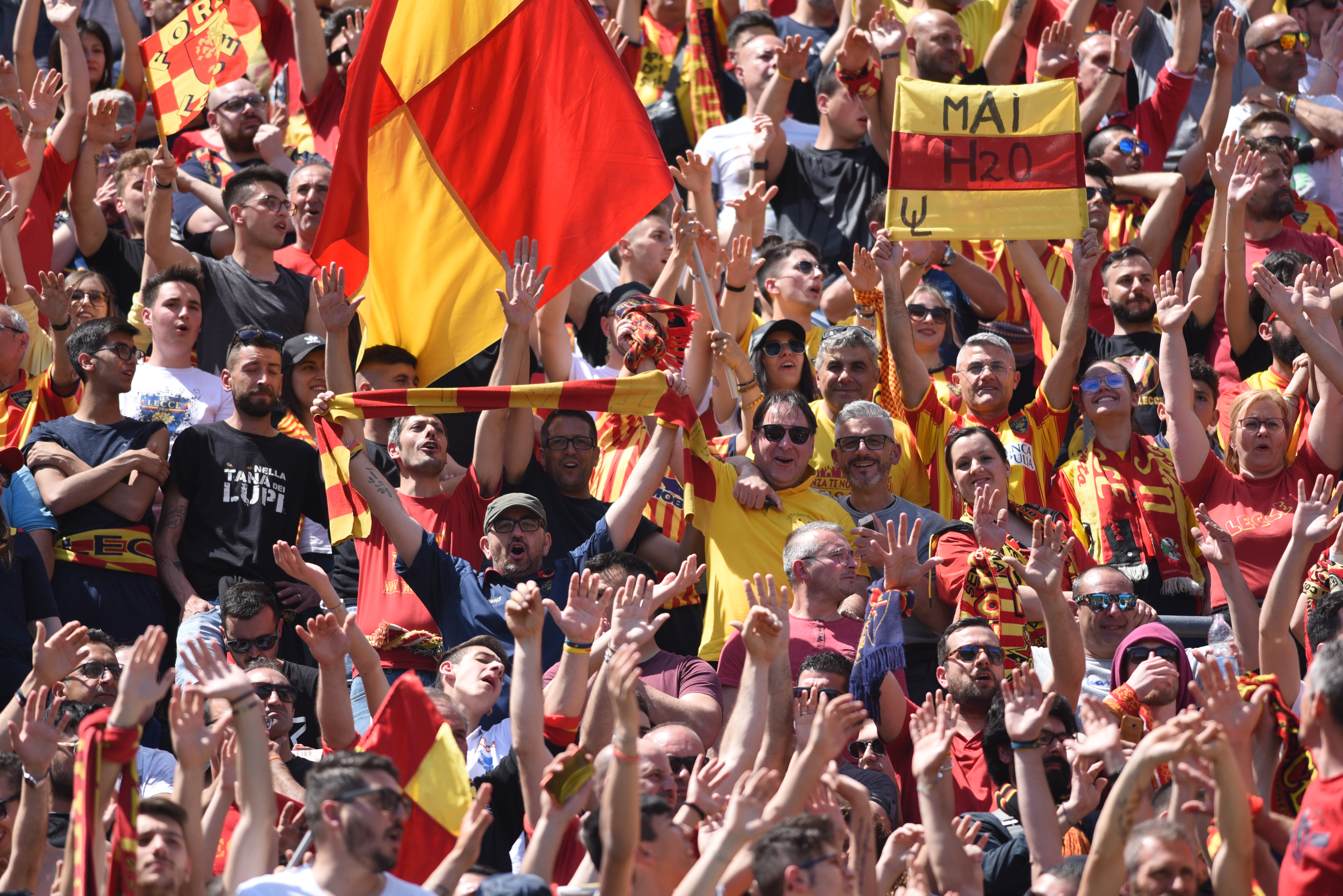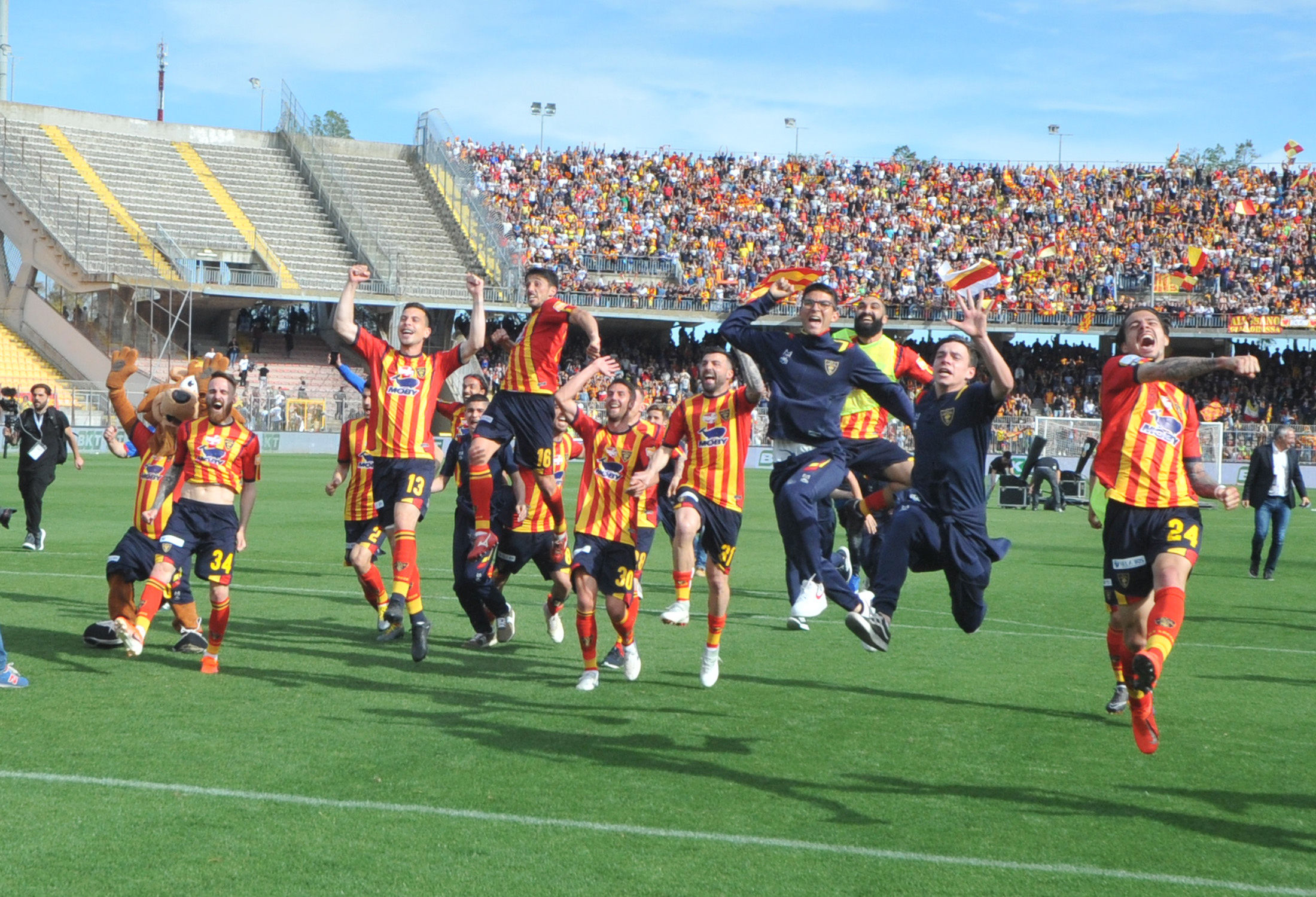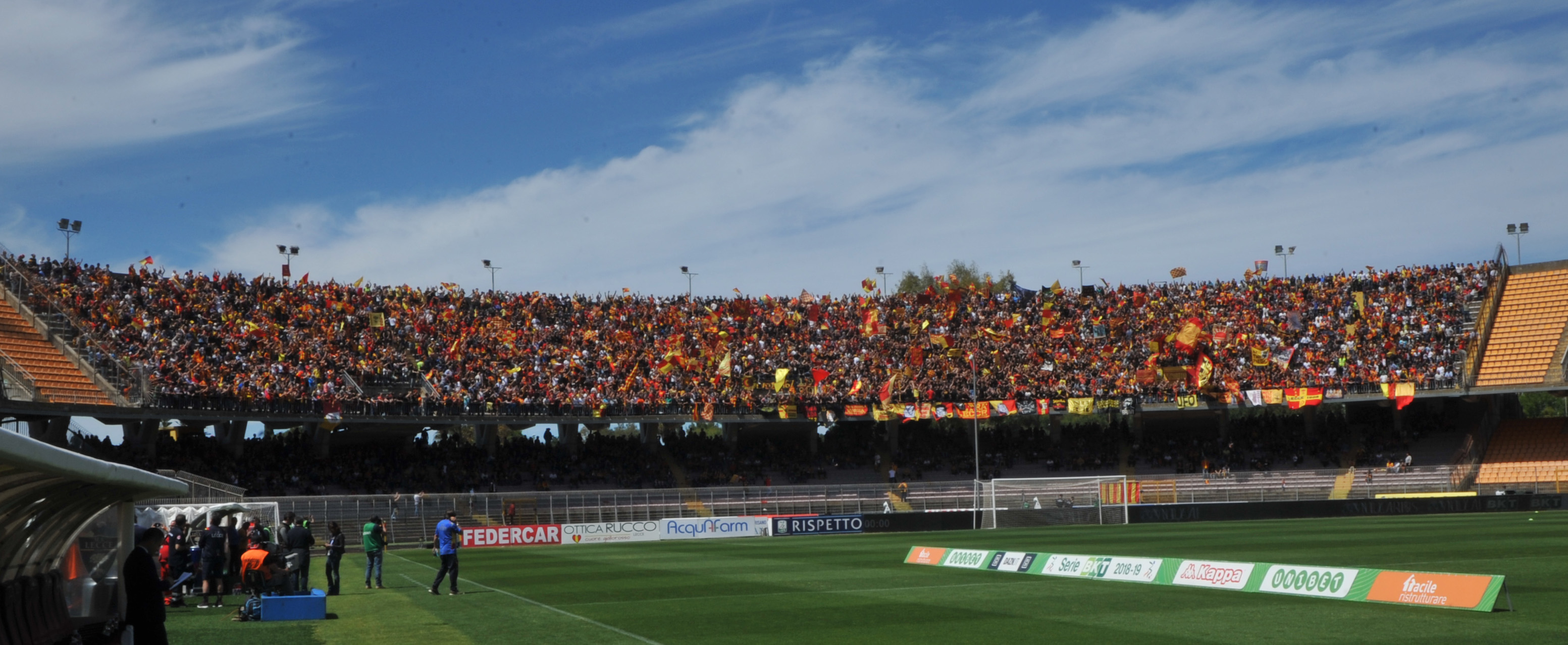 La giornata è iniziata molto presto, ore prima dal fischio d’inizio: la città si è svegliata trepidante, vogliosa di festeggiare un traguardo che sembrava solo un miraggio un anno fa, quando dopo 6 stagioni si salutava la Lega Pro. Alle ore 12 l’apertura dei cancelli dello stadio, tre ore prima del fischio d’inizio, con gli spalti gremiti con 30mila tifosi, riempitisi nel giro di pochi minuti.