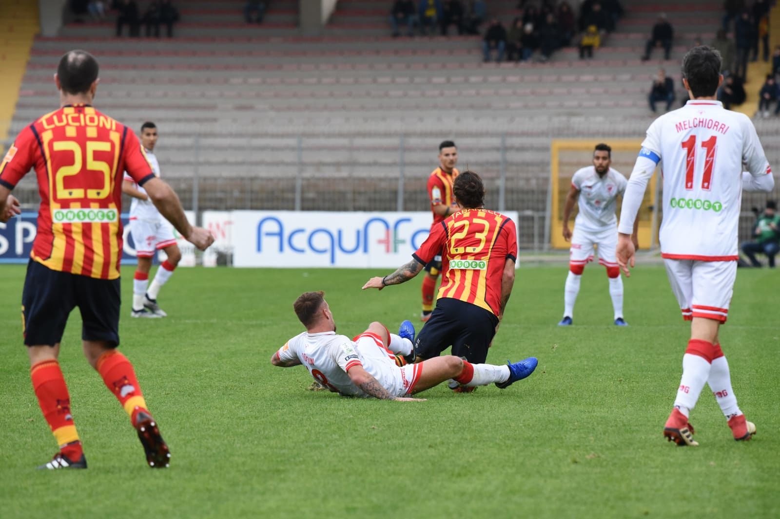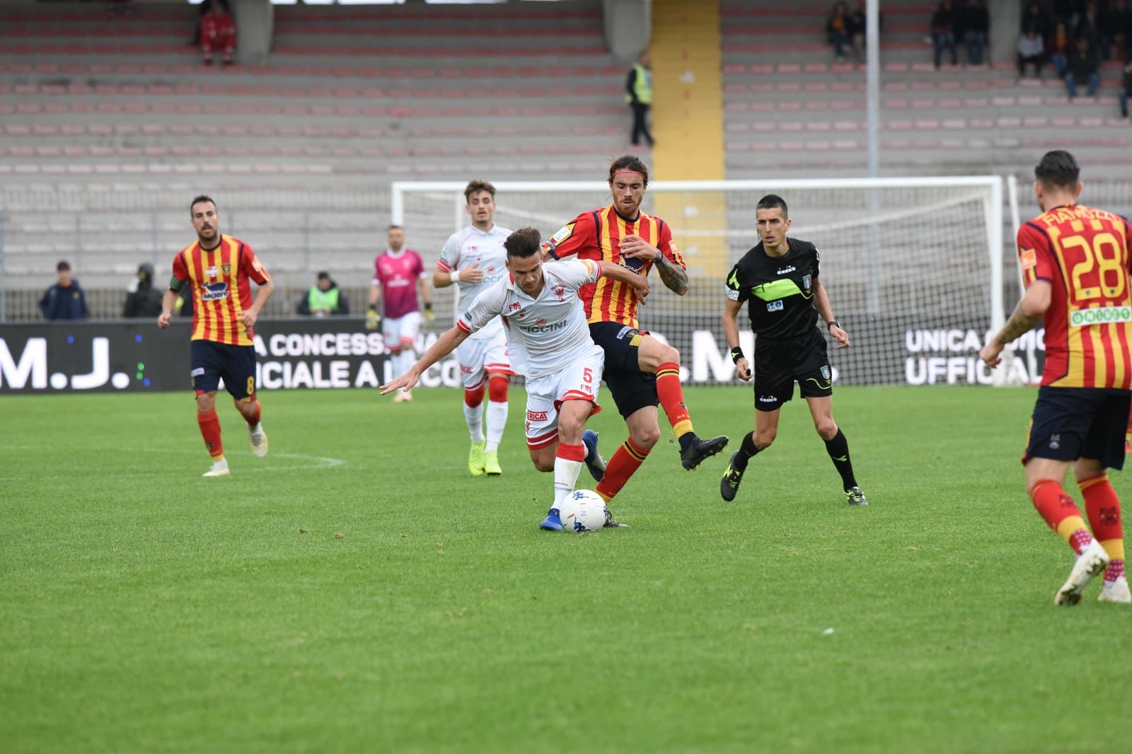Minuto 80: tiro dalla bandierina in favore del Lecce, palla verso Lucioni che manca l’appuntamento col gol, poi una serie di batti e ribatti favoriscono i grifoni che liberano frettolosamente l’area di rigore. Doppio giallo estratto dall’arbitro al 39′: prima il primo indirizzato a Melchiorri per una entrataccia su Petriccione, l’altro sventolato a Lucioni.