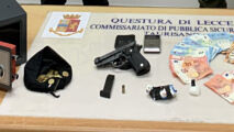 L’arresto a seguito della perquisizione da parte degli agenti di Polizia del Commissariato di Taurisano che hanno trovato la droga, l’arma e il denaro.