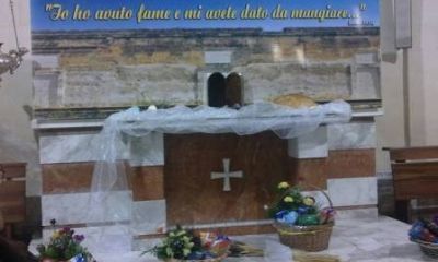 Lecce. Commovente allestimento nella parrocchia di Santa Maria della Pace a Lecce, dove è¨ stato preparato il cosiddetto sepolcro con una gigantografia della casa fatiscente in cui sono morti i due clochard Dino Martina e Veronica Pigini. Il parroco don Simone Renna dedica a loro la Pasqua di quest'anno