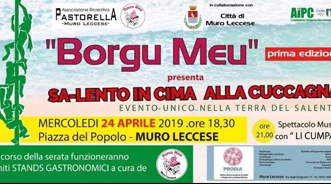 Attualità / 19 Aprile 2019 11:06 A Muro Leccese è ancora tempo dell’albero della Cuccagna, la prima edizione primaverile de “lu Borgu meu” Il 24 aprile alle 19:30 l’appuntamento è in Piazza del Popolo per assistere alla competizione dello storico gioco di tre squadre. Musica e cibo tradizionale accompagneranno la serata. Di Cosimo Iaia