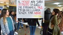 La scuola non può restare in silenzio di fronte alla guerra in Siria, per questo tutti gli alunni dell'istituto De Marco-Valzani e delle altre scuole che hanno aderito grazie al tam tam sui social hanno esibito in un corteo i cartelloni con i loro pensieri contro la guerra.