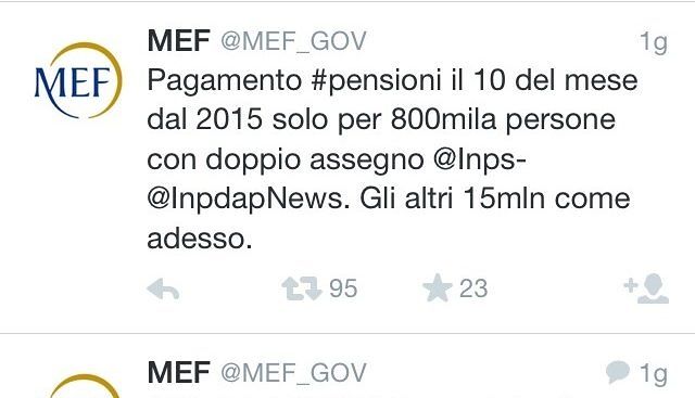 Politica / 23 Ottobre 2014 14:11 Pensioni e bonus bebè. Il Governo ‘tweetta’ alcune precisazioni Il Ministero dell'Economia e delle Finanze si dimostra al passo con i tempi e fa via Tweetter alcune precisazioni in merito alla Manovra Finanziaria che attende di diventare legge. Focus su pensioni e bonus bebè. Di Redazione
