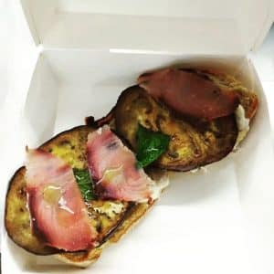 - crostone con salume di tonno/ricciola e caciocavallo fuso;