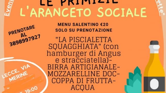 Venerdì 1 settembre, a partire dalle 19.00, ritornano all’ Aranceto Sociale di Via Merine, a Lecce, le esperienze enogastronomiche made in Salento in un’atmosfera sensoriale semplice e ricercata, in cui sedie e tavolini, appositamente improvvisati, si adattano al percorso capriccioso disegnato da alberi di arancio e di limone al chiaro di luna. Il tutto in un clima familiare, di amore per ciò che si produce e si condivide.