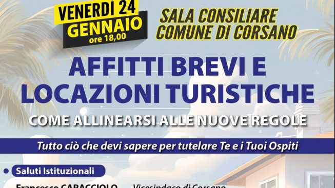 Venerdì 24 gennaio, alle ore 18:00, si terrà un incontro dedicato al settore turistico degli affitti brevi presso la sala consiliare del Comune di Corsano.