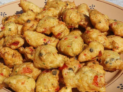- Preparate la pastella con farina, uova e sale mescolati tra loro. Aggiungete poco alla volta l’acqua e mescolate fino ad avere un composto omogeneo senza grumi non troppo liquido. Versate nella ciotola contenente la pastella le verdure tritate e aggiungete i capperi e i pomodori e mescolate tutti gli ingredienti.