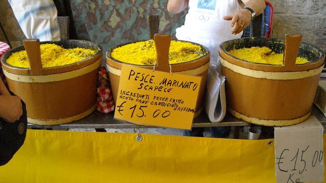 Se vi trovate in Salento, non perdete l’occasione di assaggiare la scapece gallipolina, uno dei piatti più antichi, a base di pesce fritto marinato con mollica di pane imbevuta di aceto e zafferano