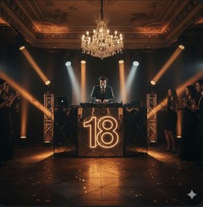 Immagina un angolo del salone dedicato alla musica, dove il dj opera in un ambiente che non stona con l’eleganza circostante. La consolle del dj è nascosta da una struttura pulita, rivestita in pannelli neri opachi o lucidi. Frontalmente, il numero “18” o l’iniziale del festeggiato/a è illuminato con un neon a led color oro caldo, creando un punto focale sofisticato. L’illuminazione circostante è soffusa, con faretti che proiettano luci dorate e ambra, e magari qualche faretto “wash” a led che crea un effetto di luce nera sulle pareti, mantenendo l’ambiente intimo e chic anche quando la musica si fa più movimentata.