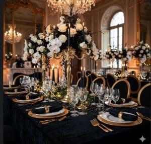 Immagina tavoli rotondi o rettangolari coperti da eleganti tovaglie nere in velluto o raso opaco. Ogni posto è arricchito da un sottopiatto dorato lucido, piatti neri o bianchi con bordo oro, posate dorate e calici in cristallo. Il tovagliolo nero in tessuto è fermato da un anello dorato. Al centro, imponenti centrotavola con candelabri dorati e composizioni floreali di rose bianche e orchidee.