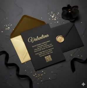 Immagina un cartoncino rigido di colore nero opaco, con tutti i dettagli dell’evento stampati in un sontuoso color oro laminato. Il font è un mix di un elegante script per il nome del festeggiato/a e un serif raffinato per le informazioni. Il tutto è racchiuso in una busta interna dorata e una esterna nera, sigillata con ceralacca dorata e l’iniziale.