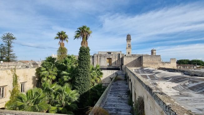 Situato sulla via che conduce da Porta Rudiae a Piazza Duomo, nell’arteria principale del centro storico di Lecce, il complesso cultuale dei Teresiani Scalzi fu fondato intorno al 1620, nell’area donata dall’abate Annibale Mercurio, canonico della Cattedrale, al padre genovese Antonio Clemente. Tra Seicento e Settecento il monastero consolidò i propri possedimenti e tutto il comprensorio fu denominato “Isola degli Scalzi”. La costruzione, austera e regolare, è costituita da due ordini separati tra loro da un cordolo marcapiano. Agli angoli sono presenti due ispessimenti della muratura quasi fossero dei torrioni di rinforzo, che interrompono la linearità della struttura e danno alla facciata una sensazione di maggiore solidità e compattezza. Al centro dell’ordine inferiore si apre il portale, privo di ogni fregio architettonico ad arco a tutto sesto che richiama la forma delle finestre del pianterreno. L’interno è tutto incentrato sul chiostro, caratterizzato a piano terra dal classico quadriportico, mentre al primo piano la linearità dei corridoi si interrompe nel lato prospiciente la chiesa. In occasione delle Giornate FAI sarà possibile visitare questo luogo speciale che, nel tempo, è stato un luogo di preghiera, poi caserma dei militari e dei Reali Carabinieri ed infine Liceo.