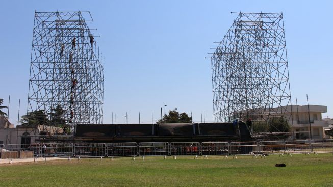Sono iniziati i lavori per la costruzione del maestoso palco che quest’anno ospiterà il Concertone finale di Melpignano del 26 agosto. La struttura, sarà ancora più grande rispetto allo scorso anno, circa il 20% in più con un palco di 330 mq. La superficie complessiva dell’impianto è di 33x19m per un’altezza di 16m. Il palco dove si esibirà l’Orchestra Popolare, il Corpo di ballo e gli ospiti internazionali, sarà interamente coperto. Il materiale utilizzato è acciaio ferroso per la struttura portante e alluminio per il tetto. Sulle torri laterali saranno installati 200mq di led per i videowall attraverso i quali saranno proiettate le immagini del Concertone in diretta.