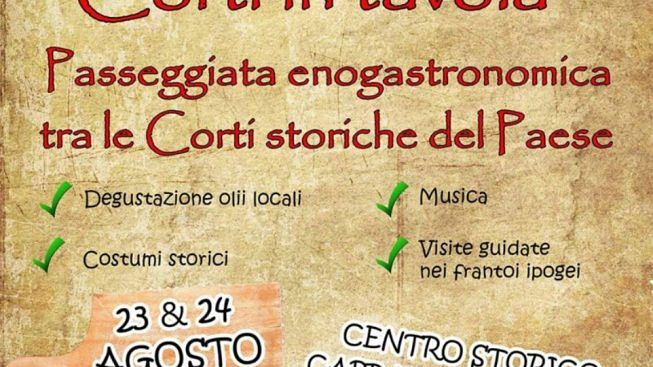 Si comincia martedì 23 e mercoledì 24 con una manifestazione dedicata alla degustazione degli olii pregiati prodotti sul territorio. L’evento nel nome del prezioso ‘oro giallo’ prende il nome di Corti in Tavola e si tratta di una vera e propria passeggiata enogastronomica tra le corti storiche di Caprarica. Non solo cibo per i palati più esigenti, ovviamente. Ma anche tanta, tanta musica e tanta cultura, vista la possibilità di effettuare visite guidate nei frantoi ipogei del luogo. Animatori in costume d’epoca intratterranno turisti, vacanzieri e salentini che aspettano queste occasioni per rivivere i sapori di un tempo in una location d’eccezione.