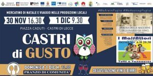Sono queste solo alcune iniziative cui si darà vita nelle giornate di sabato 30 novembre e domenica 1 dicembre in Piazza Caduti a Castri di Lecce, dove si svolgerà la quarta edizione di “Castri di Gusto”