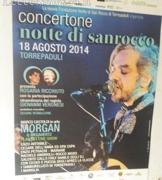 Guest star di oggi sarà il grande interprete italiano Marco Castoldi, in arte Morgan. Lo stesso Concertone, prodotto da Cesare Vernaleone e presentato dall’attrice e regista teatrale Rosaria Ricchiuto, insieme al noto regista cinematografico Giovanni Veronesi, si terrà nella magnifica piazza di Largo San Rocco. Un'operosa macchina organizzativa che vede come principale protagonista proprio la Fondazione Notte di San Rocco di Torrepaduli, presieduta da Pasquale Gaetani.