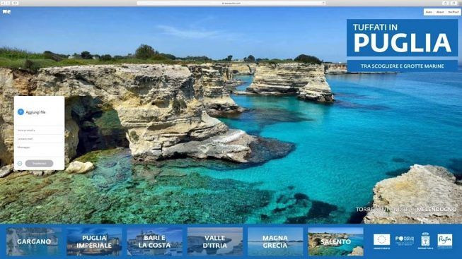 Fino al 3 luglio, chi utilizza il noto portale per inviare e ricevere file di grandi dimensioni “from A to B”, come si legge sul sito ufficiale, si troverà di fronte agli scatti dei luoghi più belli e suggestivi, dal Gargano al Salento (con Torre Sant’Andrea a Melendugno). Senza dimenticare la Valle d’Itria e la costa di Bari, dove assaporare il pescato del giorno. Scatti che raccontano al meglio il territorio e che finiranno sul desktop di milioni di utenti.