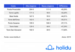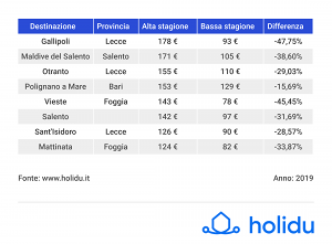 Se da un lato il Salento ha i prezzi medi più alti per soggiornare una sola notte in alta stagione, dall’altro resta una valida opzione dove poter trascorrere le vacanze durante il periodo di bassa stagione, con un risparmio di circa il 36% rispetto alle altre province della regione.