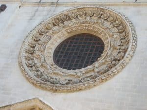 Il rosone è formato da quattro fasce. La prima, la più esterna, è una corona di foglie di alloro lanceolate. La seconda ospita fiori di melograno, simbolo di abbondanza e prosperità. Nella terza si alternano i volti degli angeli che reggono con la bocca pesanti festoni, la quarta scolpita a foglie di acanto, simbolo di resurrezione, accoglie l’ampia vetrata. Le dimensioni sono imponenti: non si direbbe, ma ha un diametro di circa cinque metri e mezzo. Anche la profondità è notevole, dalla vetrata di due metri e mezzo alla cornice esterna vi sono almeno un paio di metri.
