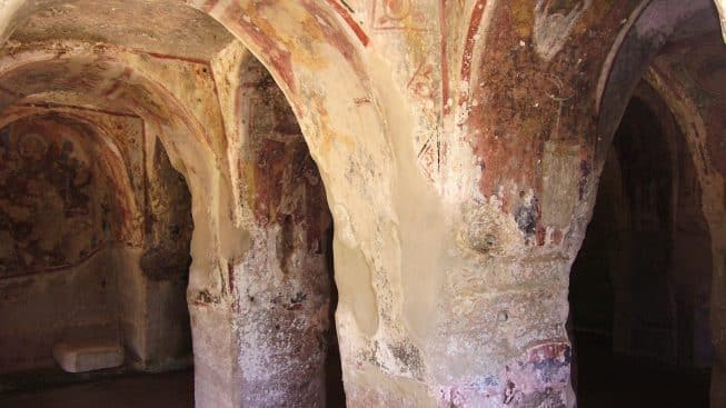 Interamente scavata nella roccia, a tre navate divise da pilastri, con tre absidi, la cavità non è stata usata solo come luogo di culto. Nel corso dei secoli ha ospitato fedeli, ma anche animali secondo un’antica leggenda. Si racconta, infatti, che un prete cattolico l’avesse adibita come stalla per il suo asino che probabilmente non si aspettava di ricevere tanta considerazione dal suo padrone che gli consentiva di dormire e mangiare in compagnia dei Santi. C’è San Basilio, San Nicola e San Giovanni Crisostomo nell’abside sinistra. C’è Santa Caterina, vestita con abiti regali e con il capo cinto da una corona che regge i suoi segni iconografici: la palma, simbolo del martirio, nella mano destra e la ruota dentata nella sinistra e Sant’Antonio Abate. C’è la Vergine con il Bambino, incorniciata da tre bande di colore giallo, bianco e blu e un bellissimo affresco nell’abside centrale che racconta un episodio tratto dall’Apocalisse di Giovanni.