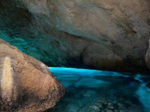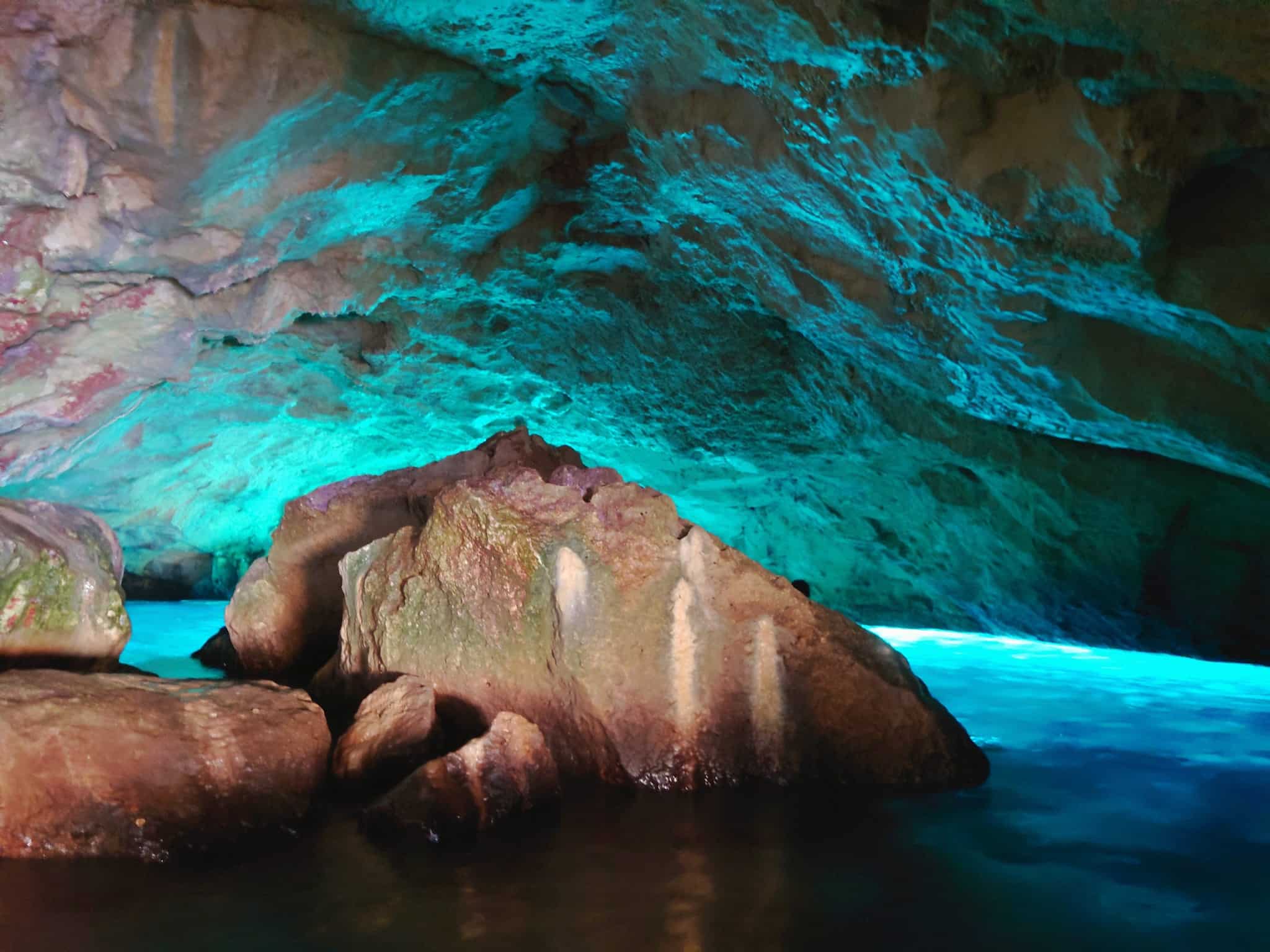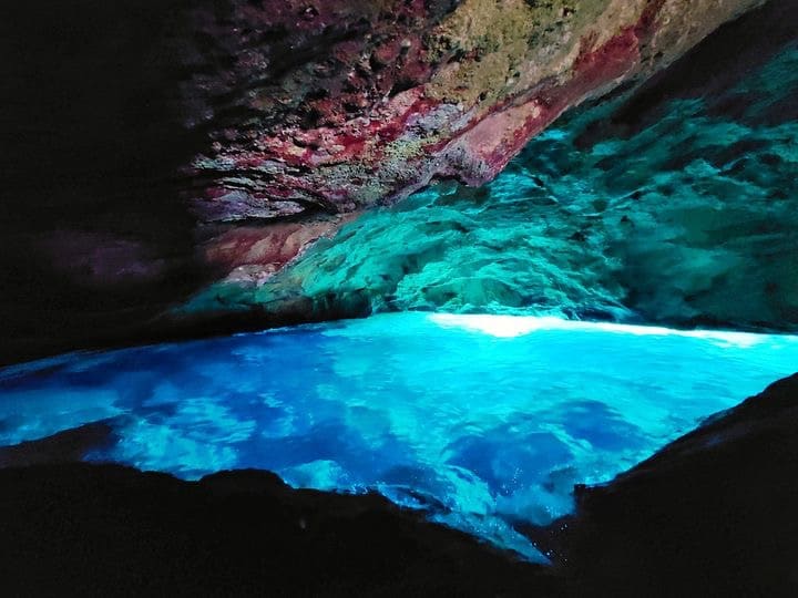 La ‘cavità’ naturale ricoperta di stalattiti e conchiglie fossili ha diverse particolarità: ci sono diversi scogli quasi a livello dell’acqua da cui è possibile ammirare lo spettacolo stando comodamente “seduti” sulla roccia, ma la cosa che la rende unica sono i colori. Una volta entrati – senza grandi difficoltà – da un’apertura abbastanza stretta, lo spettacolo è indescrivibile. Dalle fessure penetra la luce solare che si riflette sul mare di un color verde acqua/cobalto, regalando uno spettacolare gioco di luci e di colori che si riflettono sullo specchio del mare e sulle pareti interne della grotta. Effetti di luce quasi fluorescente che cambiano ad ogni ora del giorno.