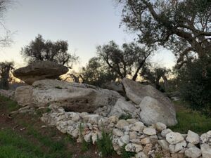 Lì, in questo luogo magico, fino all’arrivo della xylella fastidiosa i vecchi ulivi mormoravano storie. Ora tocca alle pietre mantenere viva la tradizione. Al Piede di Ercole, l’impronta lasciata per andare a sconfiggere i Titani. Al Furticiddhru de la Vecchia, l’arcolaio con cui la moglie di ‘Orcu Nanni’ fila mentre decide le sorti dei contadini, Lu Lettu e l’acchiatura, il tesoro nascosto consistente in una chioccia e 7 pulcini d’oro.