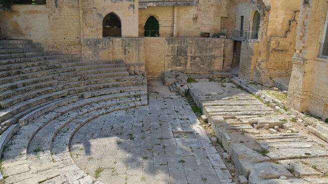 Sembra quasi voglia rimanere segreto, protetto dai vicoli del centro storico di Lecce. Non è raro che i turisti in vacanza nel Salento finiscano per scoprire il Teatro romano, per caso, perdendosi tra i vicoli sconosciuti della città, magari dopo aver ammirato la bellezza della Chiesa di Santa Chiara. Tra i palazzi di quelle strade poco frequentate, lontano dal cuore della movida, si nasconde un gioiello di inestimabile valore, un monumento maestoso tanto da ospitare – si racconta – fino a 5mila spettatori che in passato hanno ammirato commedie e tragedie illuminati dalle stelle. Forse è poco conosciuto, offuscato dalla bellezza del ben più noto anfiteatro, che non passa inosservato a piazza Sant’Oronzo. Eppure è l’unico teatro romano in Puglia.